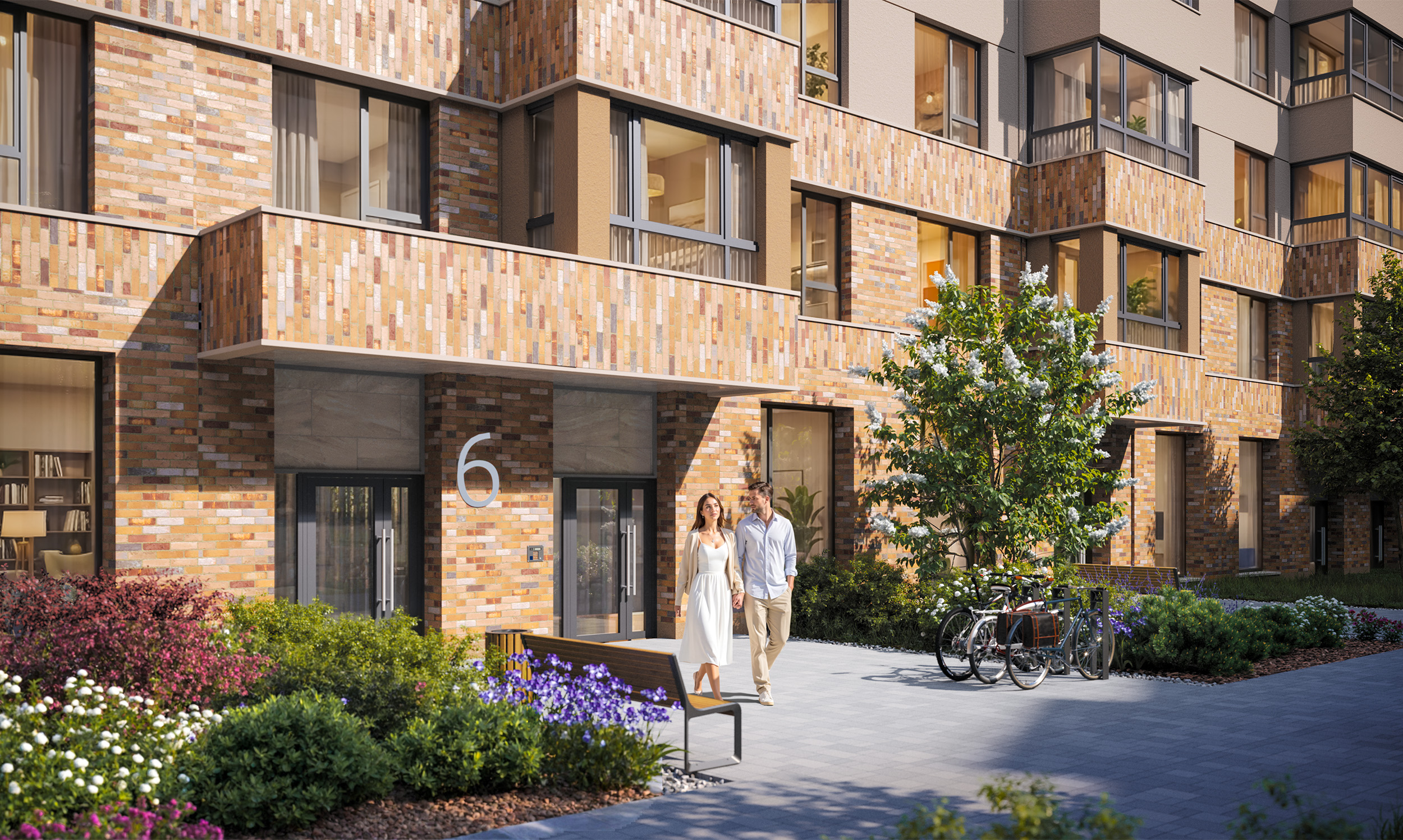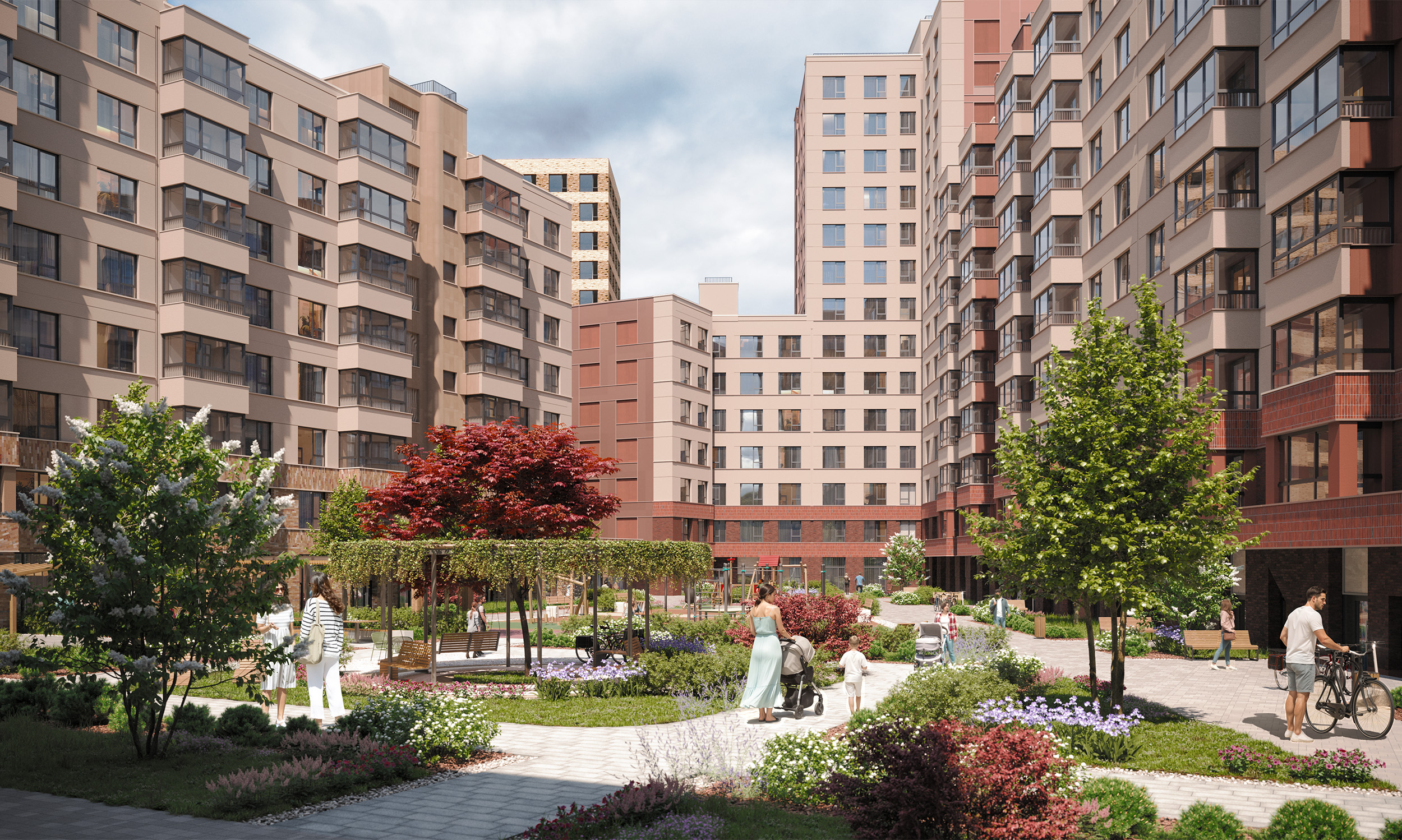 Скрытый за главными фасадами уютный зеленый двор без машин принесет жителям тишину и гармонию, возможность наслаждаться прогулками и игрой с детьми, отдыхом в тени деревьев в летний сезон и занятиями спортом на свежем воздухе.